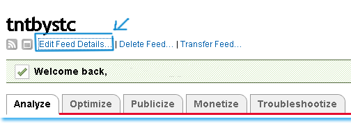 To get your Feed URL, Log into your Feedburner Account and click on Edit Feed Details as shown below,